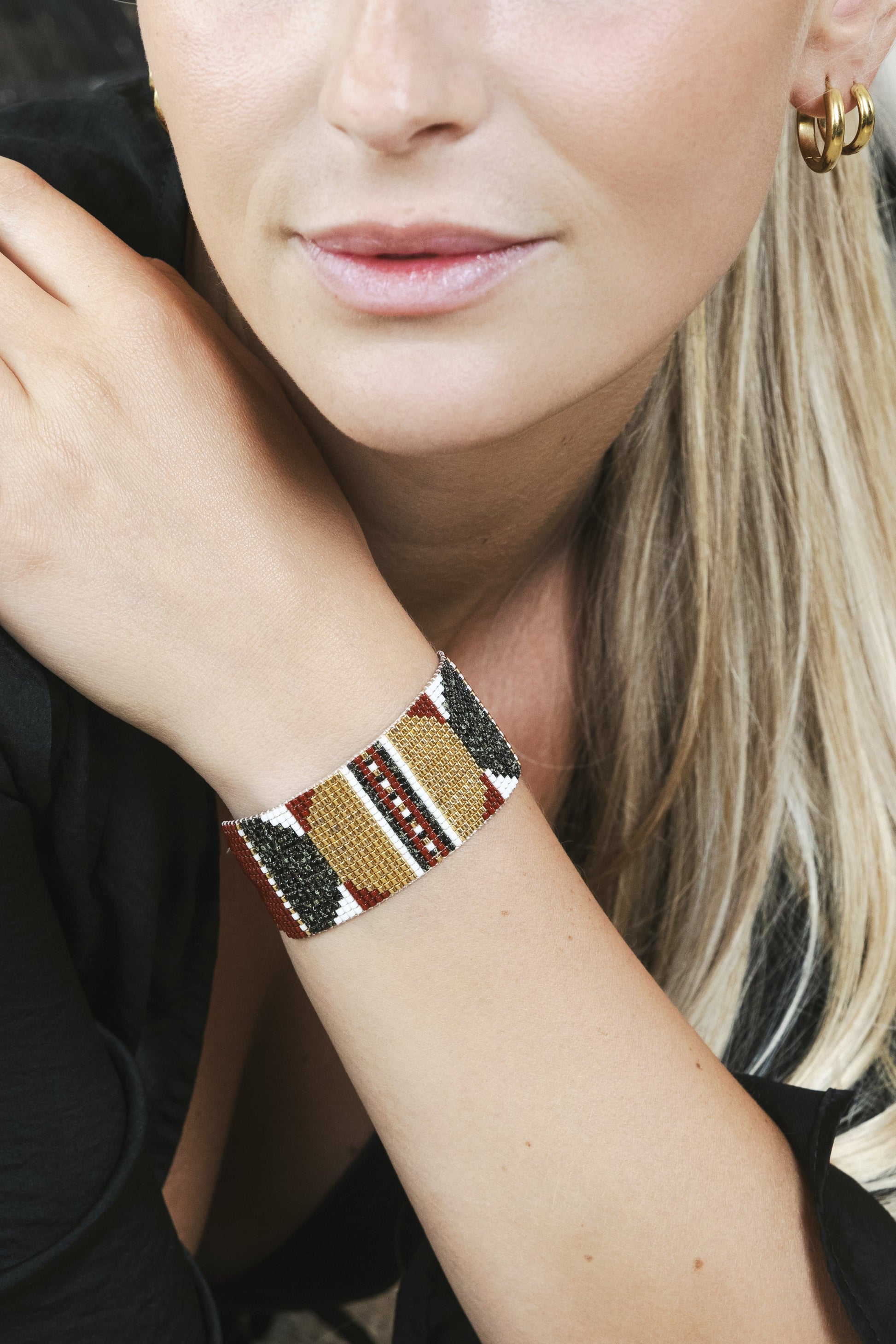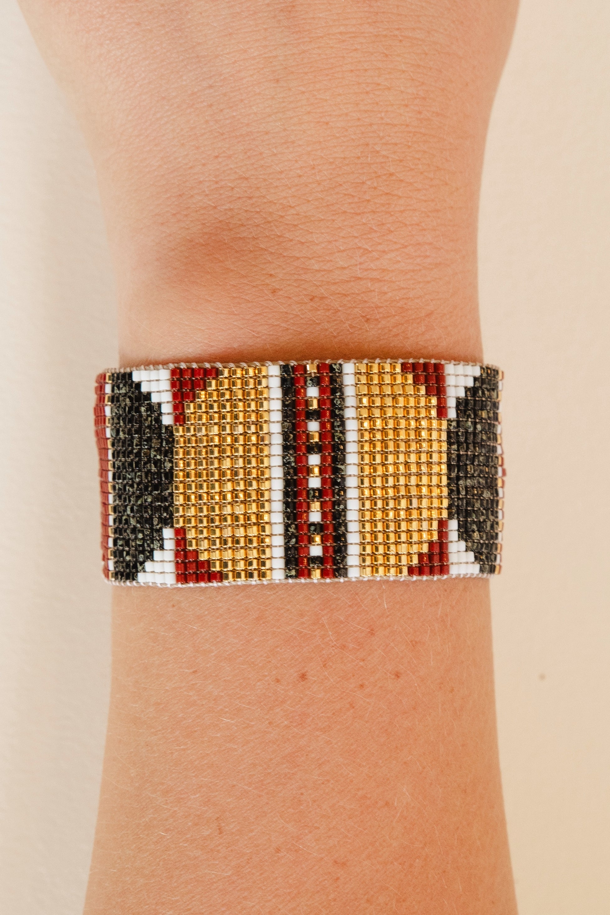Bold yet refined, the Eclipse bracelet in Deep Maroon brings depth and warmth to your wrist. Handwoven from precision-cut Miyuki Japanese glass beads in deep maroon, creamy white, sandy black, and accents of 24K gold plating, it captures the power of contrast. Smooth, radiant, and endlessly striking.
