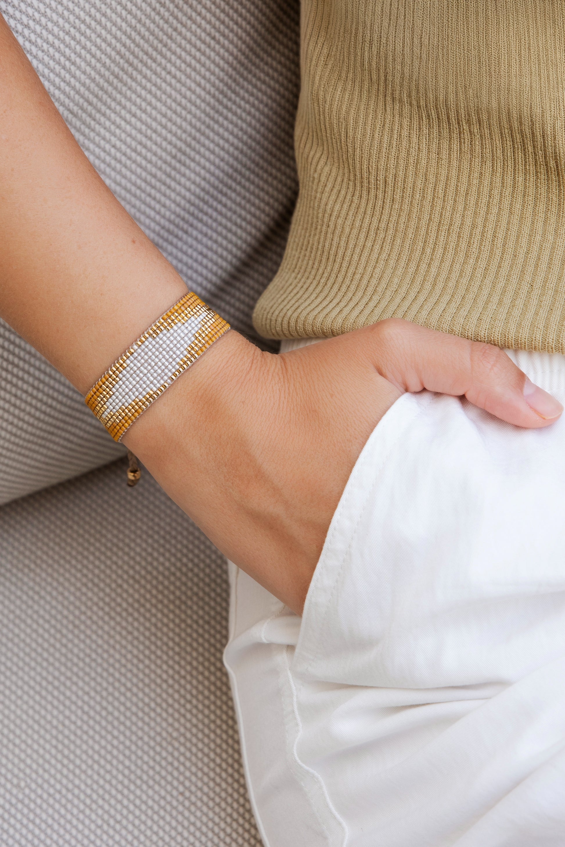 Add an effortless touch of elegance to your wrist with the Focus bracelet. Handwoven from precision-cut Miyuki Japanese glass beads in delicate shades of honey yellow, luminous white, and accents of 24K gold plating, this bracelet feels silky smooth against your skin, like a small, wearable luxury.