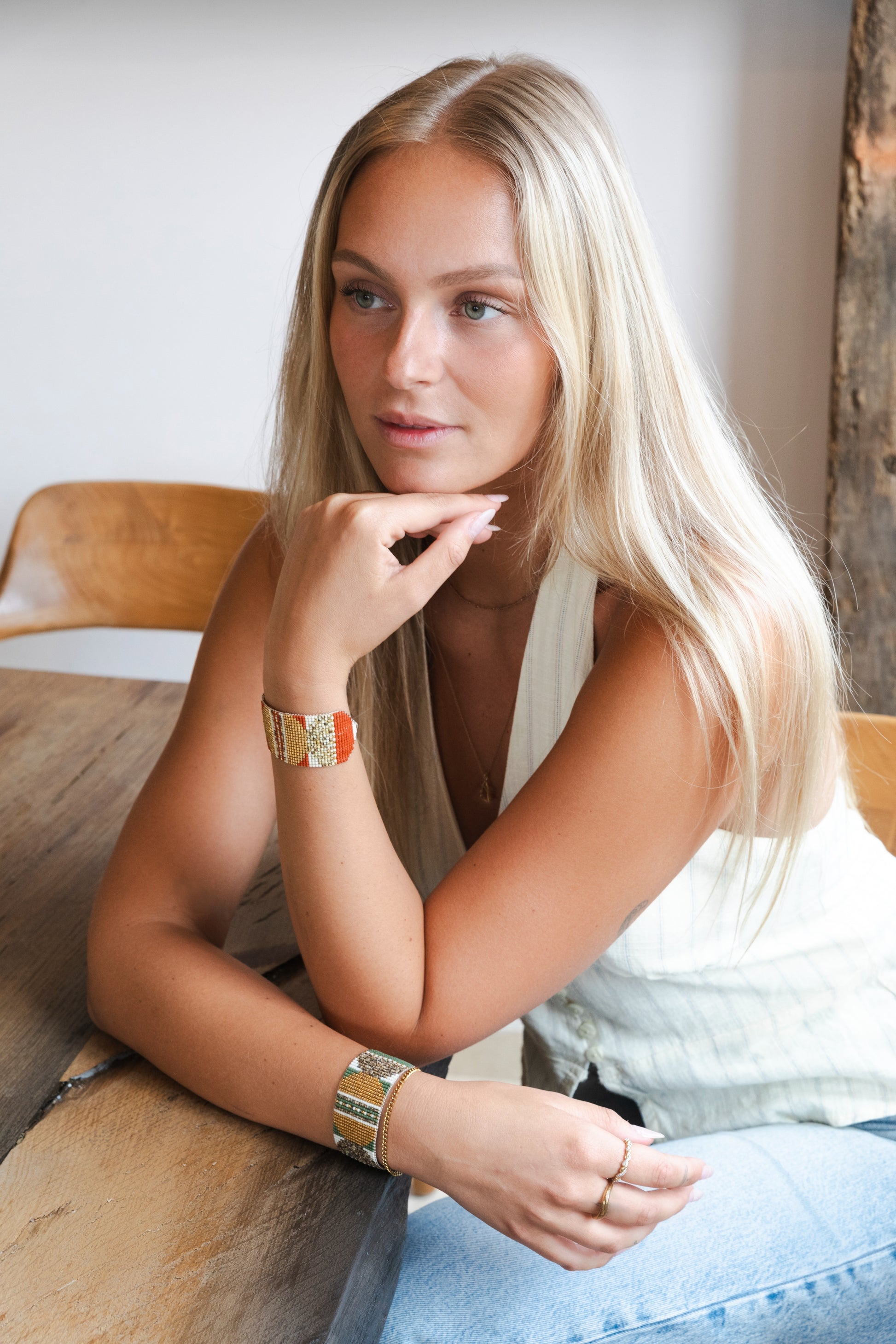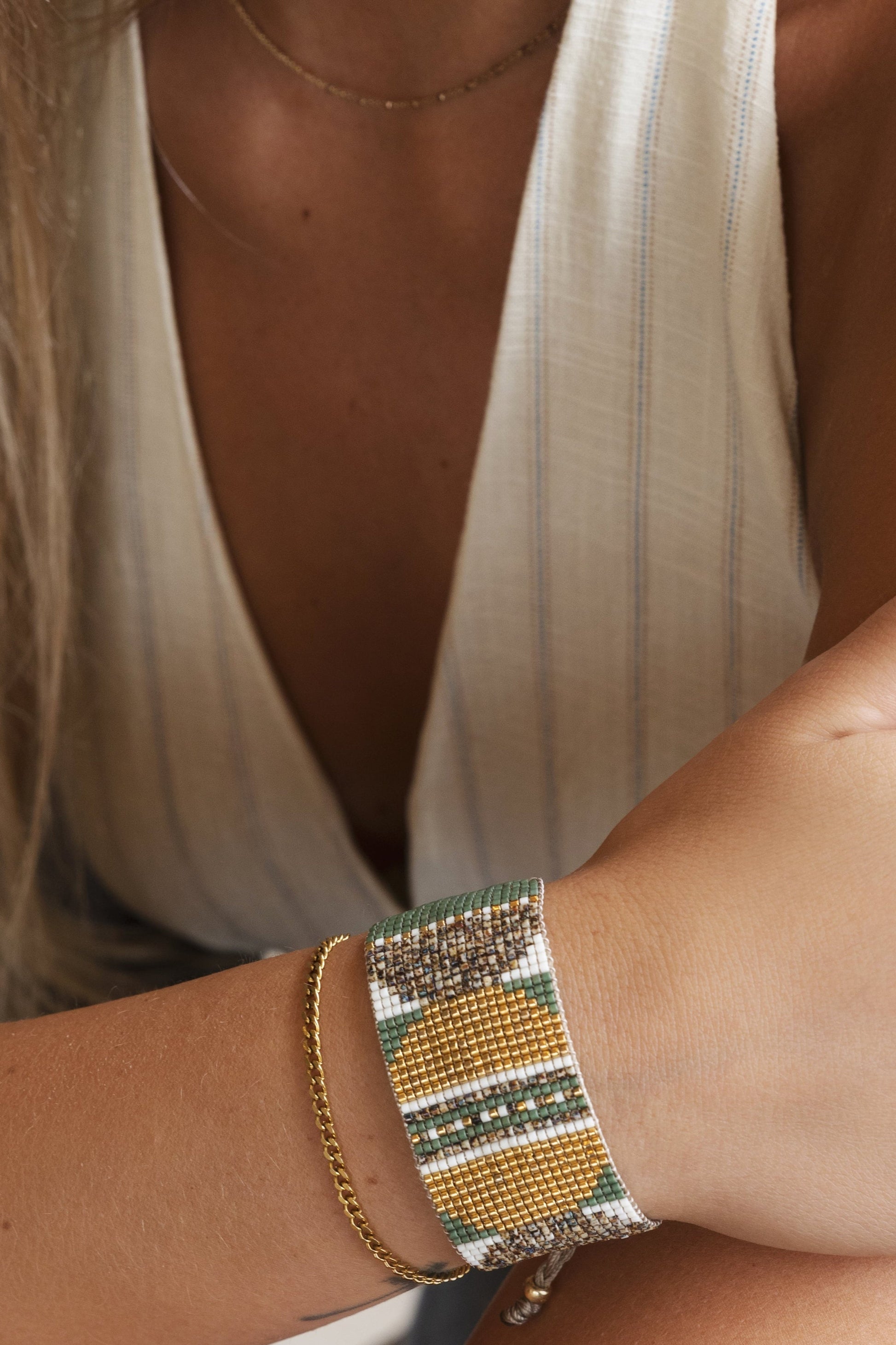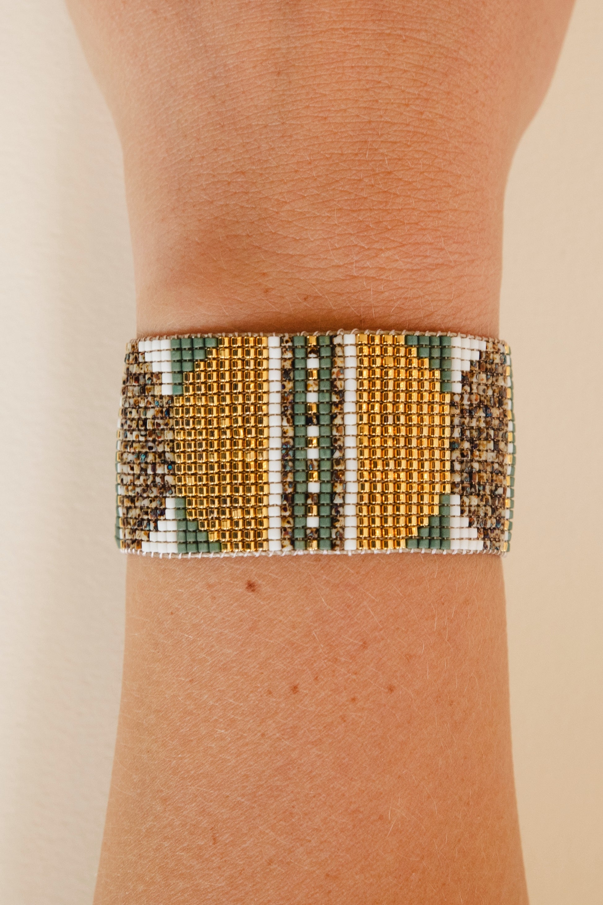 Handwoven from precision-cut Miyuki Japanese glass beads in muted sage green, creamy white, and soft sand tones with accents of 24K gold plating, this bracelet reflects balance and ease. Subtle, smooth, and naturally elegant, like a quiet breath of fresh air.